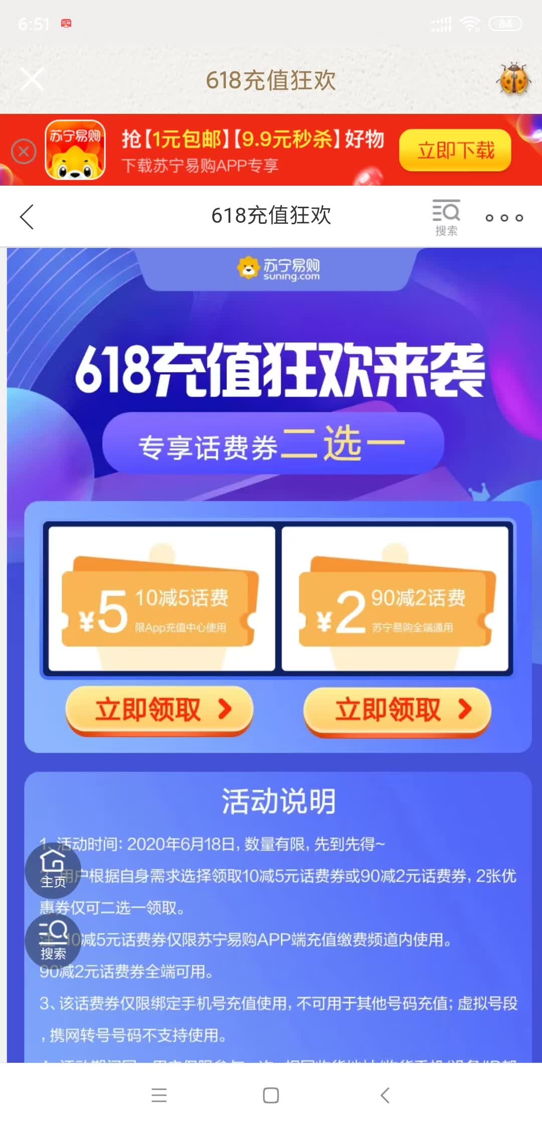 进入领苏宁易购 10减5元话费券(别领成99-2元话费券了)